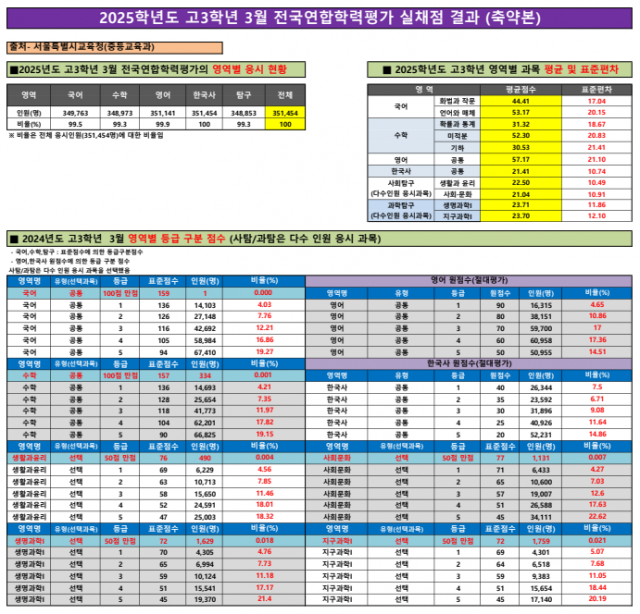 <2025학년도 고3학년 03월 전국연합학력평가 실채점 결과 (축약본)>