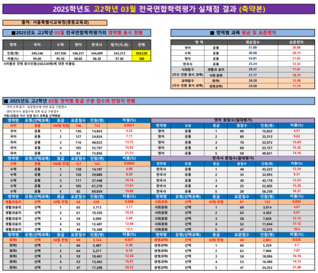 <2025학년도 고2학년 03월 전국연합학력평가 실채점 결과 (축약본)>