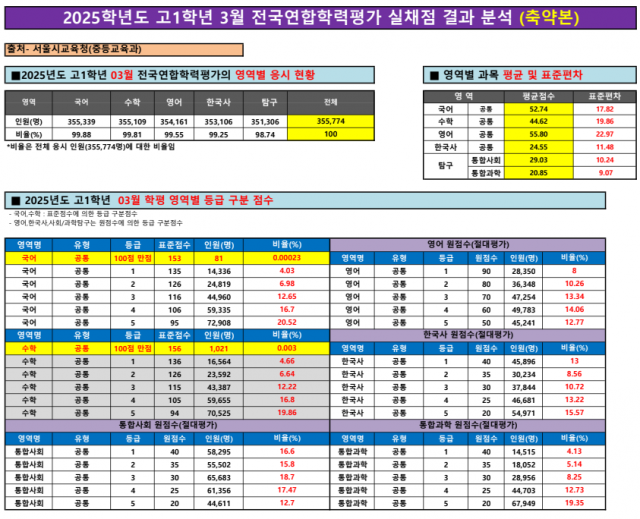 <2025학년도 고1학년 03월 전국연합학력평가 실채점 결과 (축약본)>