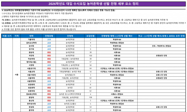 <2026학년도 대입 수시모집 농어촌학생 선발 전형 세부 요소 정리>