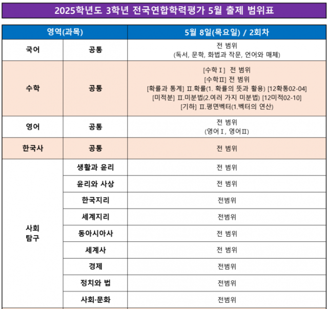 <2025학년도 3학년 전국연합학력평가 5월 출제 범위 표>