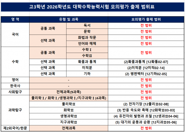 <고3학년 2026학년도 대학수학능력시험 대비 6월 모의평가 세부 출제 범위>