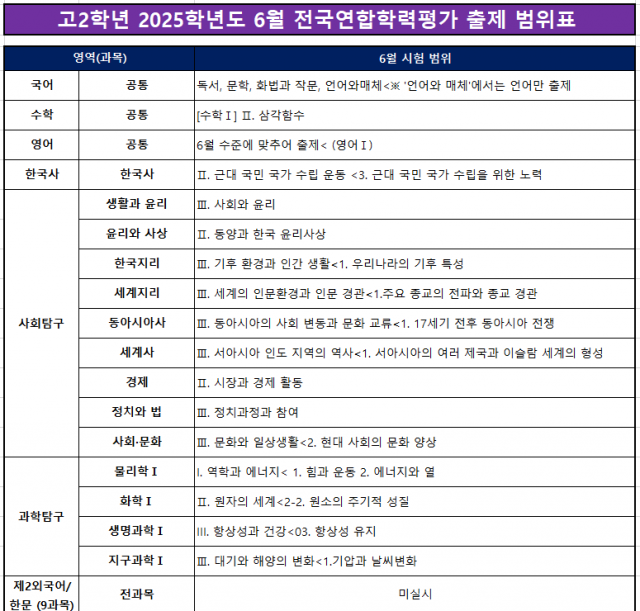 <고2학년 2025학년도 6월 학력평가 출제 범위>