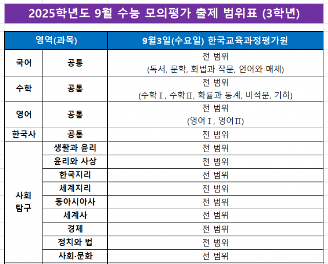 <2026학년도 대학수학능력시험 대비 고3학년 9월 모의평가 시험 범위>